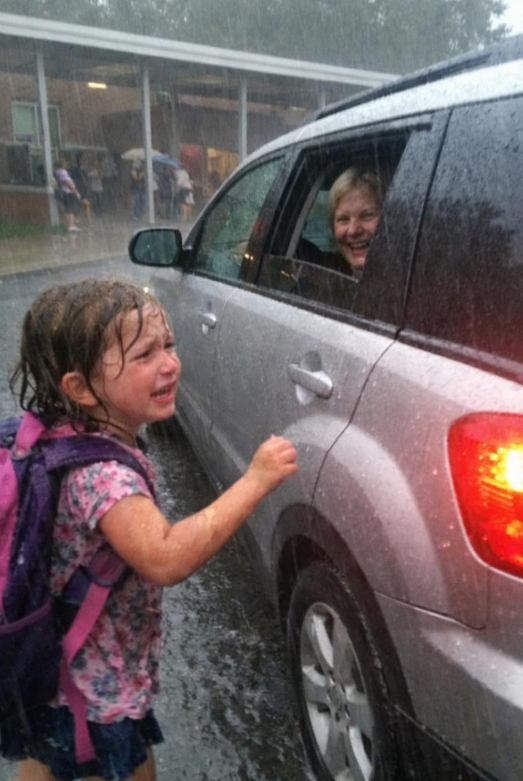 At School Pickup in the Middle of a Pouring Thunderstorm,….
