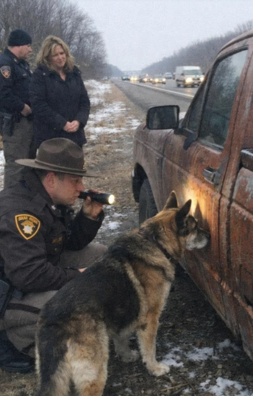 “Wait… That Dog Is Guarding Something.” — A Trooper Stopped for a Shepherd Standing Beside a Rusted Truck for Three Days… What He Found Inside Revealed a Veteran’s Final Mission.