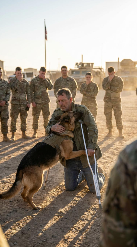 When a military K9 suddenly charged toward a badly wounded veteran struggling on crutches, the entire base braced for disaster. But in the seconds that followed, the dog’s unexpected act stunned everyone—and even the toughest soldiers were left quietly wiping away tears.