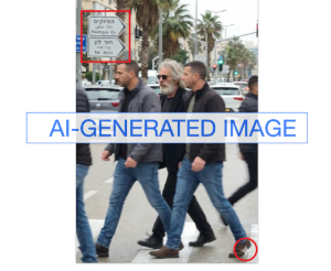 The supposed “Tel Aviv street signs” in the background contain nonsensical Hebrew translations and incorrect text that doesn’t match any actual location.