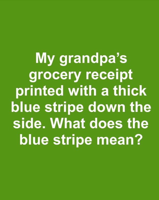 My grandpa’s grocery receipt printed with a thick blue stripe down the side. What does the blue stripe mean?