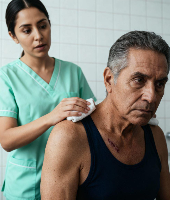 “Dad, I’m starting now,” I whispered as I began bathing my paralyzed father-in-law, but the moment his shirt came off, my breath stopped cold. My husband’s strange war:ning before he left suddenly echoed in my mind, and in that instant, everything made sense.