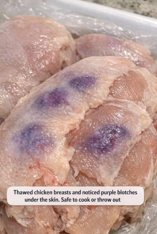 Thawed chicken breasts and noticed purple blotches under the skin. Safe to cook or throw out