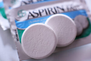 POZNAN, POL – FEB 17, 2021: Aspirin pills, a brand of popular medication, the first and best-known product of Bayer, German multinational pharmaceutical company headquartered in Leverkusen