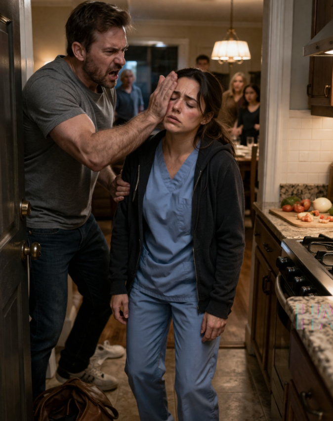 HE SLAPPED YOU THE SECOND YOU WALKED IN LATE FROM YOUR HOSPITAL SHIFT AND ORDERED YOU TO COOK FOR HIS FAMILY… BUT WHEN DINNER WAS SERVED, YOU BROUGHT OUT A BROWN FOLDER INSTEAD, PRESSED PLAY ON ONE AUDIO FILE, AND TURNED HIS PERFECT FAMILY NIGHT INTO THE MOST TERRIFYING MEAL OF THEIR LIVES
