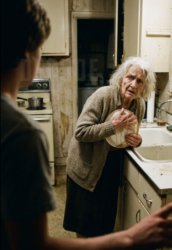 When I flipped the kitchen light switch, she didn’t just jump. She shrank back against the counter, clutching a dripping, torn paper plate to her chest like a shield. The look in her eyes wasn’t just surprise.