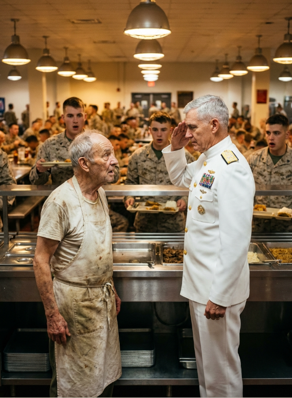 In a bustling military mess hall where Marines joked and laughed, a frail elderly cook was ridiculed and accused of never serving—until he softly spoke an old call sign, prompting an admiral to enter and salute him with deep respect as a forgotten legend.