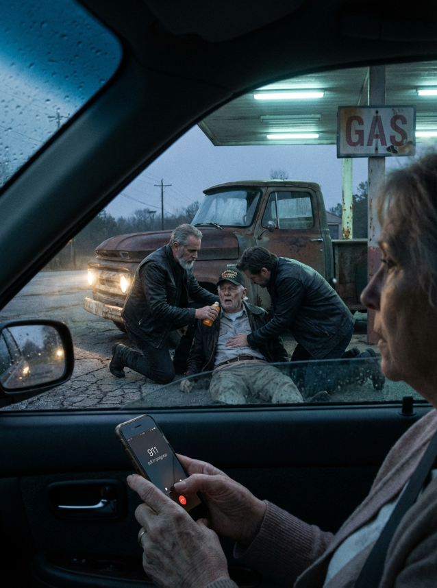 While sitting at a quiet gas station, I saw two tough-looking bikers forcing pills into a frail veteran’s mouth and called 911 in panic—only to realize minutes later that I had completely misjudged what was actually happening.
