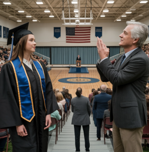 When she finally appeared in the doorway, her hair was messy. Her red blazer wrinkled like she’d slept in it for days. She clutched a folder like it could still save her.
