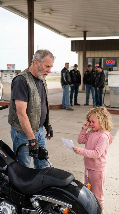An Older Biker Stopped for Gas on a Quiet Morning, Not Knowing a Six-Year-Old’s Crayon Note Would Pull Him Into a Moment That Changed Her Life Forever