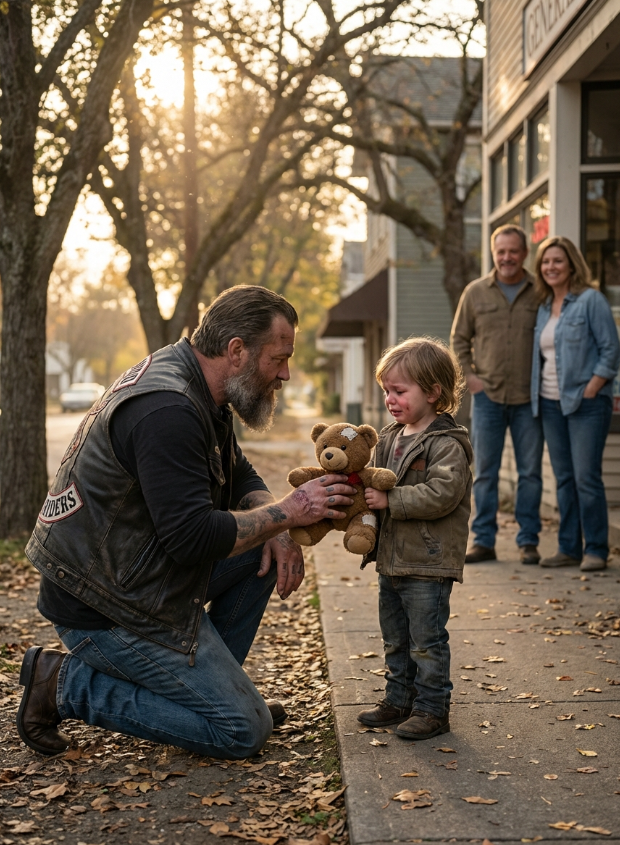 Parents locked their doors whenever he rode past, fearing the intimidating biker. But everything changed when the six-foot-five man gently returned a repaired teddy bear to a crying child, revealing a kindness no one expected to see.